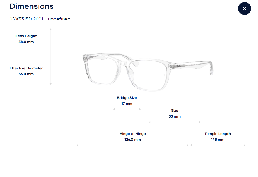 Việc lựa chọn kính đúng kích thước là rất quan trọng để đảm bảo độ vừa vặn, thẩm mỹ và thoải mái khi đeo. Ray-Ban 0RX5315D được thiết kế với các thông số như sau: