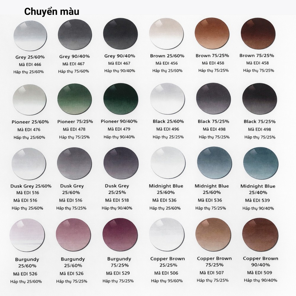 Với nhuộm màu truyền thống, tròng kính được xử lý bằng công nghệ nhuộm kiểm soát mật độ sắc tố chính xác, đảm bảo độ đồng đều màu trên toàn bộ bề mặt. Điều này giúp duy trì độ truyền sáng ổn định, hạn chế sai lệch quang học và đảm bảo các vùng nhìn xa – trung – gần vẫn sắc nét.