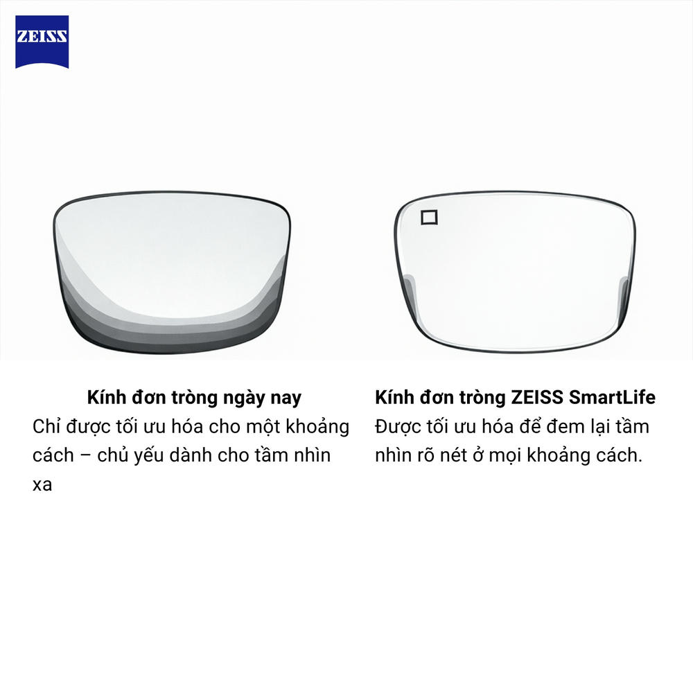 Zeiss SmartLife kính đơn tròng là dòng tròng kính đơn tròng thế hệ mới của Zeiss, được phát triển dành cho người trẻ dưới 40 tuổi có lối sống năng động và thường xuyên sử dụng thiết bị kỹ thuật số. Không giống tròng đơn truyền thống chỉ cho hình ảnh sắc nét tại vùng trung tâm, SmartLife Single Vision mang lại độ rõ nét đồng đều từ tâm ra sát rìa kính. Thiết kế này giúp mắt linh hoạt hơn khi liên tục chuyển đổi tầm nhìn giữa điện thoại, máy tính và môi trường xung quanh. Nhờ đó, người dùng cảm nhận được sự tự nhiên và thoải mái hơn trong suốt cả ngày.